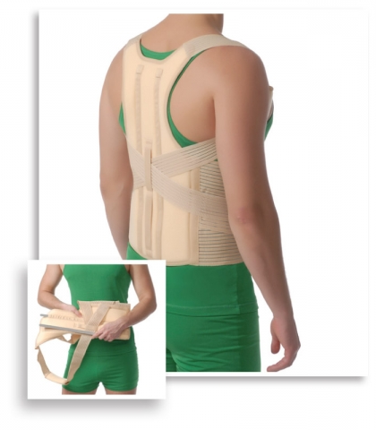 Застосовується в реабілітаційний період після операцій і травм грудного відділу хребта. Еластичні лямки утримують плечі в правильному положенні. Сталеві ребра покращують поставу та допомагають тримати спину та хребет прямо.